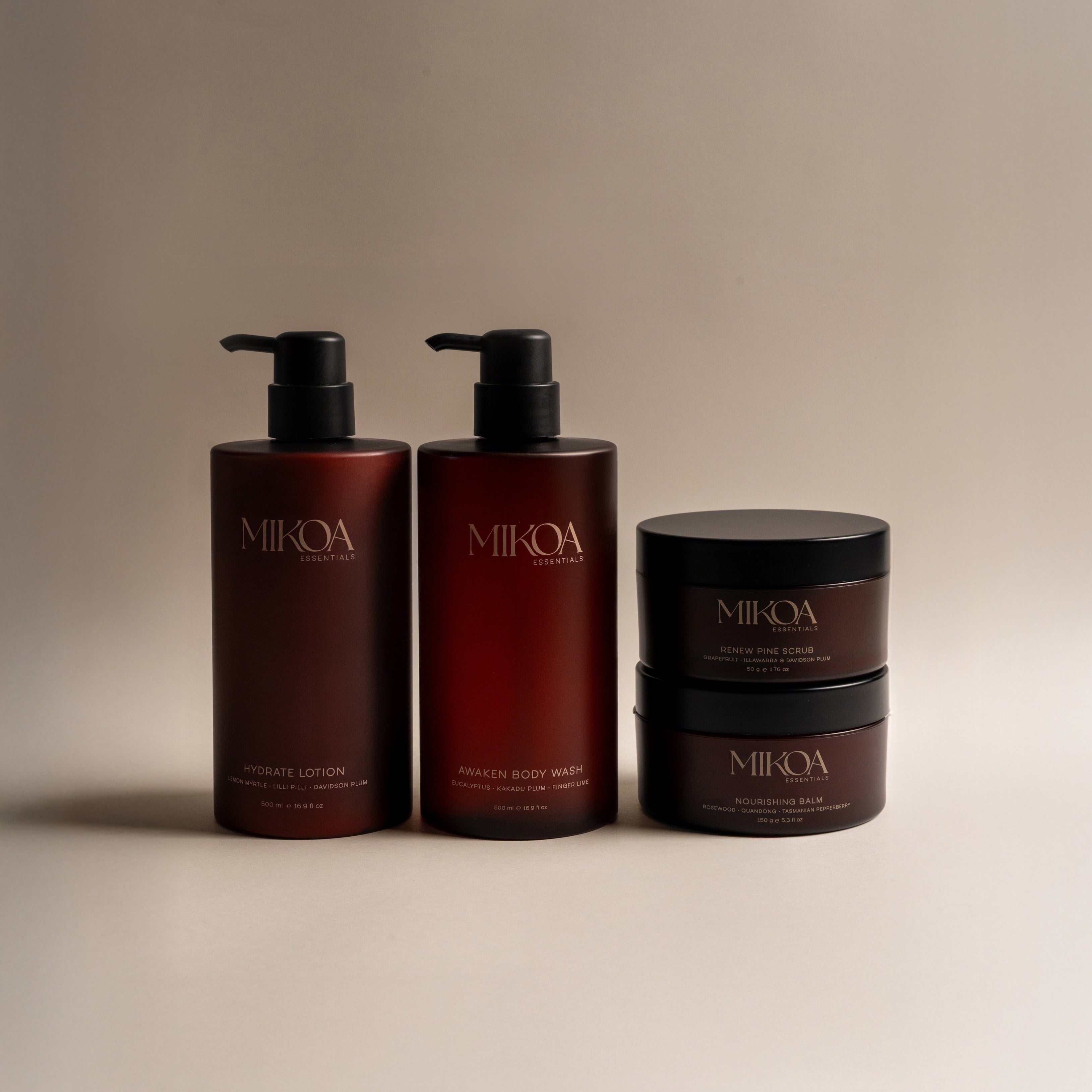 Awaken Body Wash: Aqua (Water), Glycerin, Sodium Lauroyl Sarcosinate, Cocamidopropyl Betaine, Hydroxyethylcellulose, Aloe Barbadensis (Aloe Vera) Leaf Extract, Prunus Amygdalus Dulcis (Sweet Almond) Oil, Simmondsia Chinensis (Jojoba) Seed Oil, Cocos Nucifera (Coconut) Oil, Terminalia Ferdinandiana (Kakadu Plum) Fruit Extract, Citrus Australasica Fruit Extract, Anigozanthos Flavidus Flower/Leaf Extract, Syzygium Luehmannii Fruit Extract, Calendula Officinalis Flower Extract, Helianthus Annuus (Sunflower) Seed Oil, Citrus Nobilis (Mandarin Orange) Peel Oil, Lavandula Angustifolia (Lavender) Oil, Eucalyptus Radiata Flower/Leaf/Stem Oil, Backhousia Citriodora Leaf Oil, Pelargonium Graveolens (Geranium) Oil, Ethylhexylglycerin, Citric Acid, Sodium Benzoate, Potassium Sorbate, Phenoxyethaoln